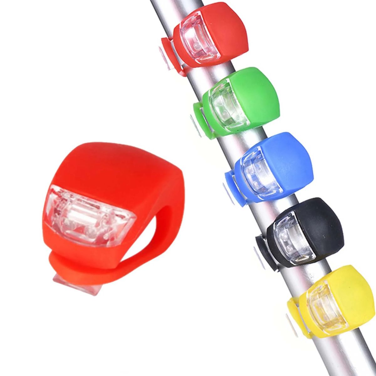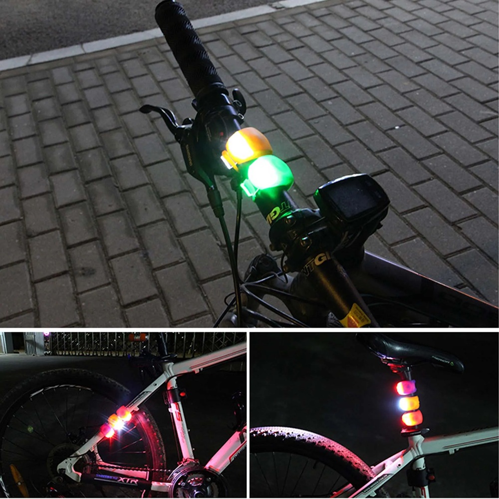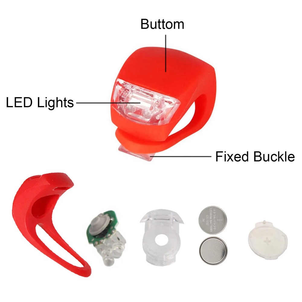 The biking light is made of silicone and high-quality LED lamp beads. Includes 2 pcs button batteries, easy to replace. This light will not be easily damaged, is easy to install quickly without any tools required, has a waterproof and anti-leaching design, and is not afraid of rainy weather. Add a light to your bike, backpack, helmet, or other areas for maximum safety. Custom is welcome.